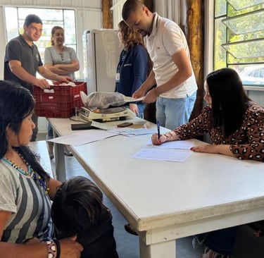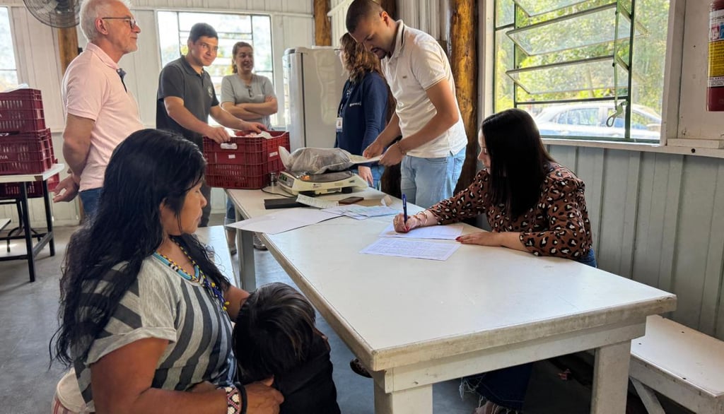 Nesta quinta-feira (23/10), equipes das secretarias municipais de Agricultura, Pecuária e Pesca e a de Assistência Social e Habitação, em parceria com a Emater e a Cooperativa de Agricultores Familiares (Coopeviva), realizaram a entrega de kits de alimentos às famílias indígenas da Aldeia Sol Nascente em Osório, por meio do Programa PAA Indígena. Ao todo, foram distribuídos 308,3 quilos de alimentos, entre eles aipim com casca, feijão preto, laranja suco, alho, batata-doce, cenoura, moranga, banana prata e polpa de maracujá.