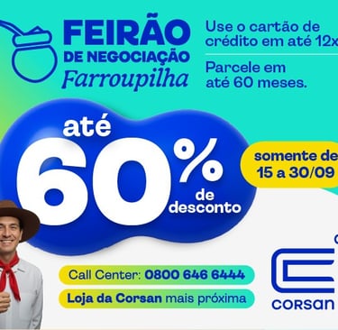 A partir da próxima segunda feira, 15, a Corsan realiza o “Feirão de Negociação Farroupilha”, onde serão oferecidas condições especiais para os clientes regularizarem débitos dos serviços de água e esgoto.