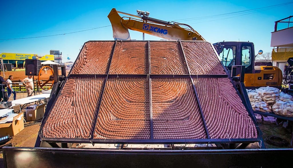 Para assar a linguiça gigante, foi necessária uma grelha sob medida, desenvolvida especialmente para a ocasião, garantindo uma cocção uniforme e segura.