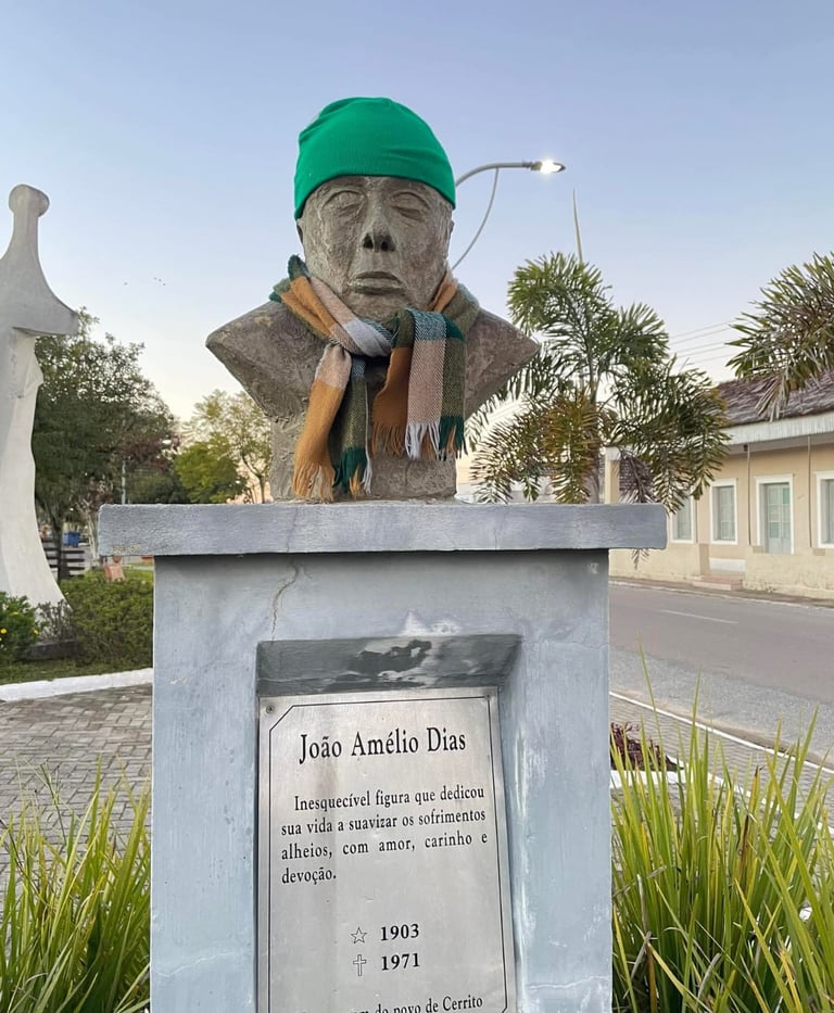 Com a onda de frio intensa que atinge o Rio Grande do Sul nesta semana, a cidade de Cerrito chamou a atenção nas redes sociais com uma ação no mínimo criativa e cheia de afeto: a estátua de João Amélio Dias, uma das figuras históricas do município, apareceu de touca e cachecol nesta terça-feira.