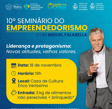No dia 18 de novembro, às 19h, na Casa de Cultura Érico Veríssimo (Av. Flávio Boianovski, 789), em Capão da Canoa, acontece o 10º Seminário do Empreendedorismo, com uma palestra imperdível de Miguel Falabella sobre o tema: