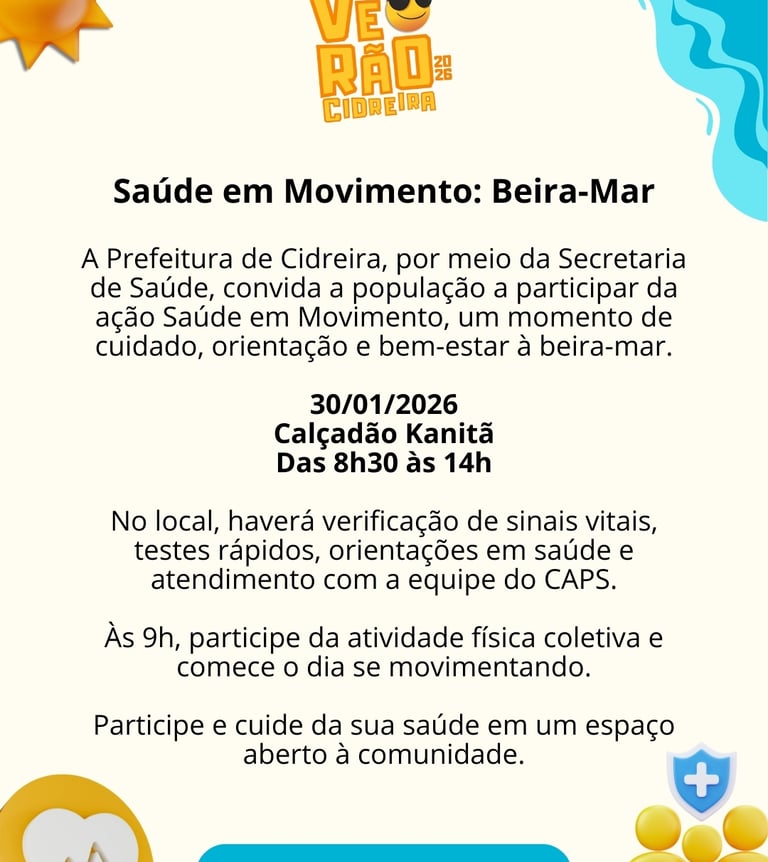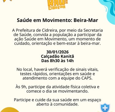 A Prefeitura de Cidreira, por meio da Secretaria de Saúde, convida a população a participar da ação Saúde em Movimento, que será realizada no dia 30 de janeiro de 2026, no calçadão Kanitã, das 8h30 às 14h.