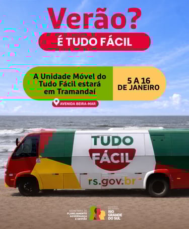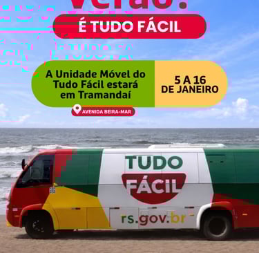 A Unidade Móvel do Tudo Fácil estará em Tramandaí, na Avenida Beira-Mar (em frente ao letreiro Eu Amo Tramandaí), entre os dias 5 e 16 de janeiro, levando serviços públicos de forma ágil, prática e acessível para moradores e veranistas.