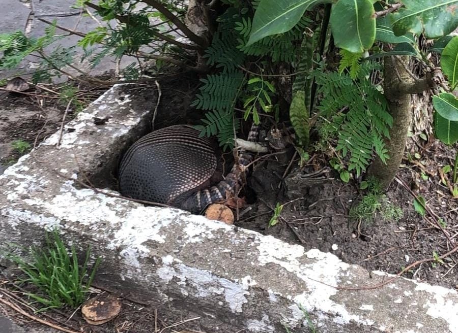 Um tatu foi avistado na tarde desta quinta-feira (16) em um pequeno canteiro, junto a uma árvore, na Rua Santos Dumont, no centro de Osório. O animal, que parecia estar se protegendo, chamou a atenção de pedestres e motoristas que passavam pela via, uma das mais movimentadas da cidade.